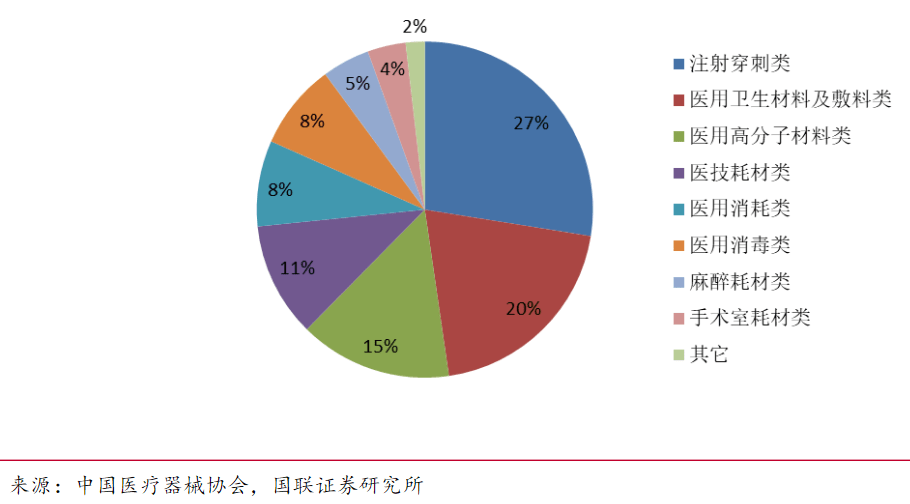其中,注射穿刺器械占比最大,市场份额高达30%;其次就是医用卫生材料及敷料类,市场份额达 22%。