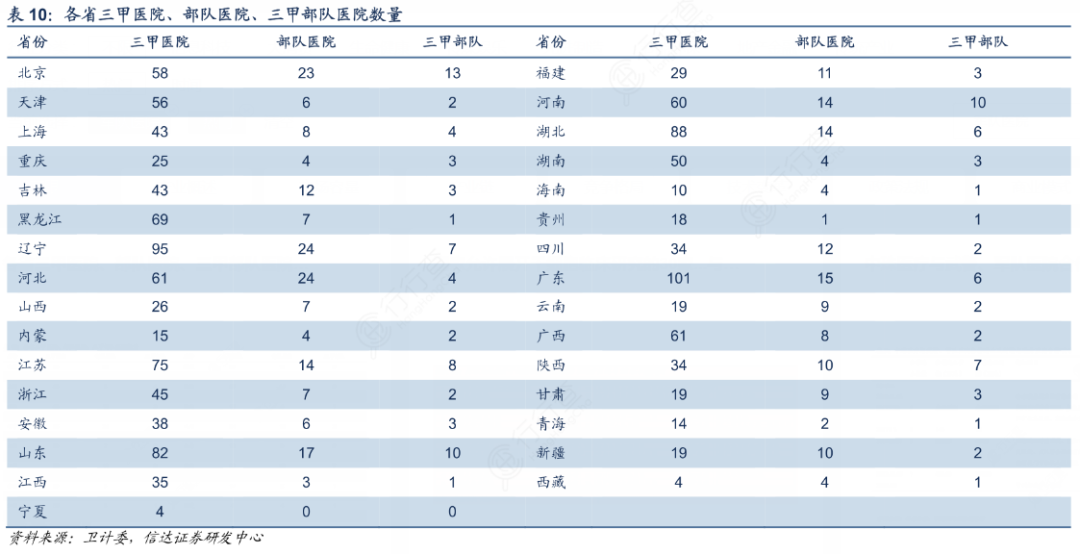立鼎产业研究网公布的《2018年各省三甲医院、部队医院、三甲部队医院数量》就显示,全国1325家三甲医院,部队医院284家,部队三甲医院就有117家。